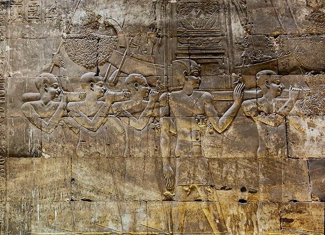 壁画描绘节日里,人们抬着装有荷努斯圣象的太阳船游行的场面