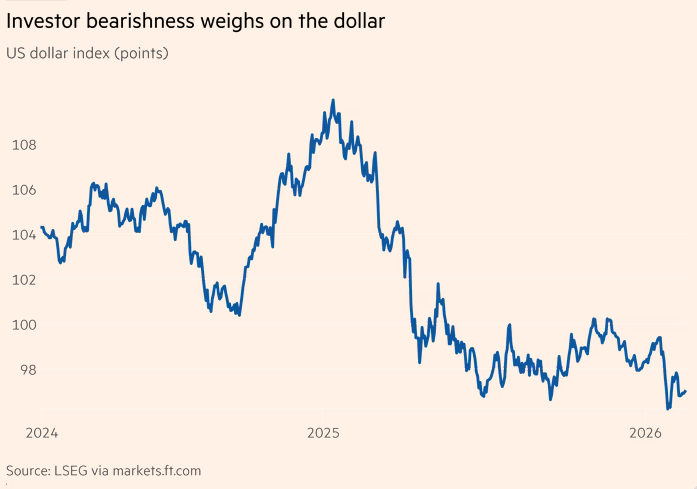 数据显示,美元今年迄今对一篮子主要货币(包括欧元与英镑)下跌约1.3%,在2025年累计下跌约9%的基础上继续承压,目前徘徊在接近四年低位的区域。