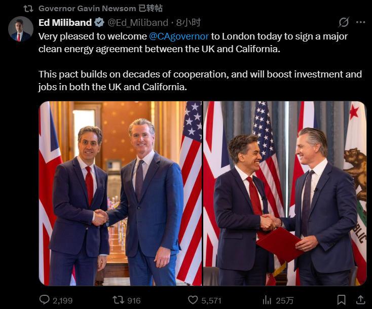 16日,纽森和英国能源大臣签署新能源合作协议 推文截图
