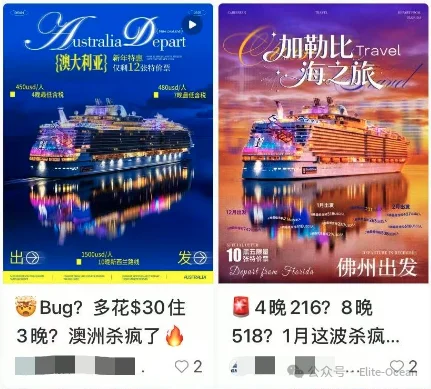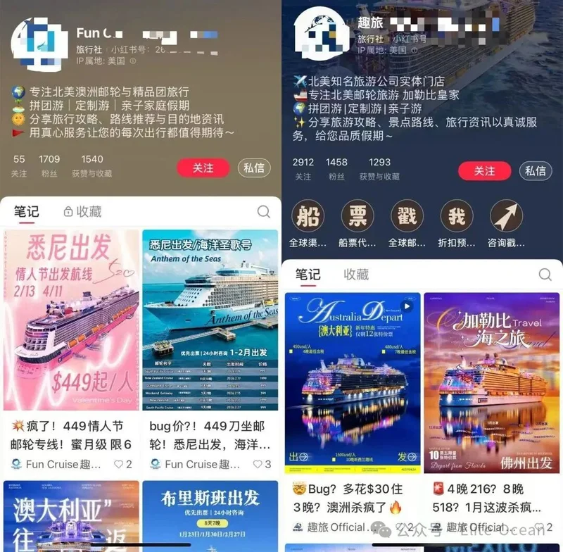 一大批打着“邮轮旅行”“官方合作”“蓝V认证旅行社”旗号的账号,疯狂在小红书投放广告,主打一个关键词:便宜!