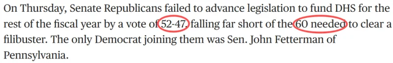 上周四(2月12日),美国参议院以52票赞成、47票反对的结果,未能推进一项为国土安全部(DHS)提供本财年剩余时间资金的法案。该结果远低于通过阻挠议事程序所需的60票门槛。