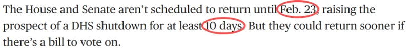 根据日程安排,众议院和参议院预计要到2月23日才会复会,这意味着国安部可能至少停摆10天。但部分国会领袖表示,如有必要就相关法案进行表决,国会则可能会提前复会。