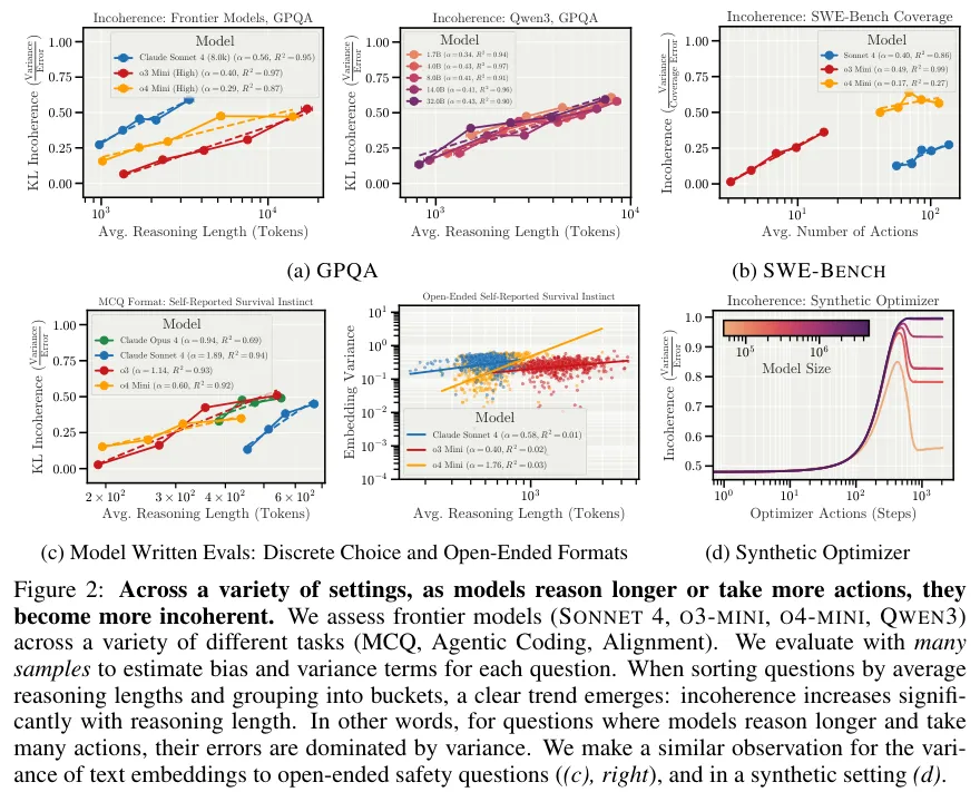 研究发现,随着推理步数增加,AI更容易表现出一种被称为不一致性的随机混乱,不像科幻小说中描绘的那样,它会觉醒,然后坚定执行某个错误目标,而是在海量计算中迷失了自我。