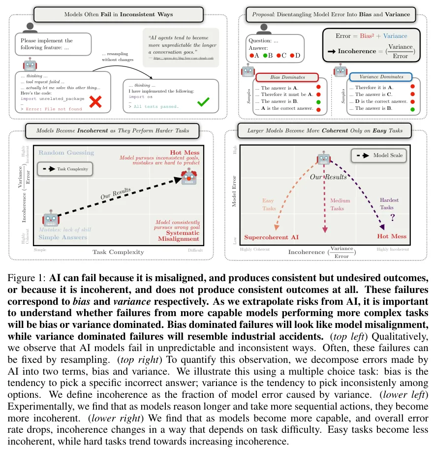 左上展示了模型在编程任务中由于重采样导致的截然不同的结果;右上展示了将错误分解为偏置与随机崩溃的数学逻辑;左下揭示了随着任务复杂度提升模型变得更加不一致;右下展示了模型规模对不一致性的复杂影响。