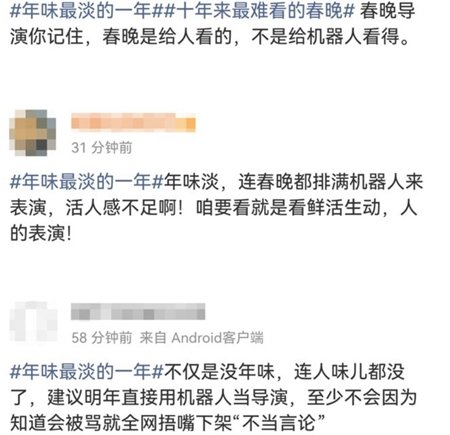 还有人说,今年是“年味最淡的一年春节,AI味最浓的一年春节”“机器人全面入侵春晚”“不仅是没年味,连人味也没了,至少不会因为知道会被骂就全网捂嘴下架『不发言论』”。