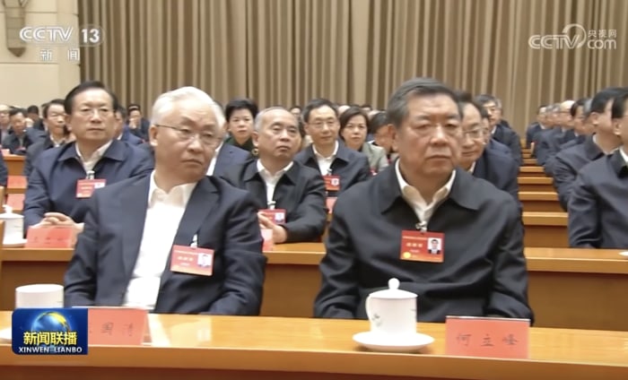 2025年4月的一次党内高层会议上,副总理何立峰(右)落座于本该属于何卫东的位置。