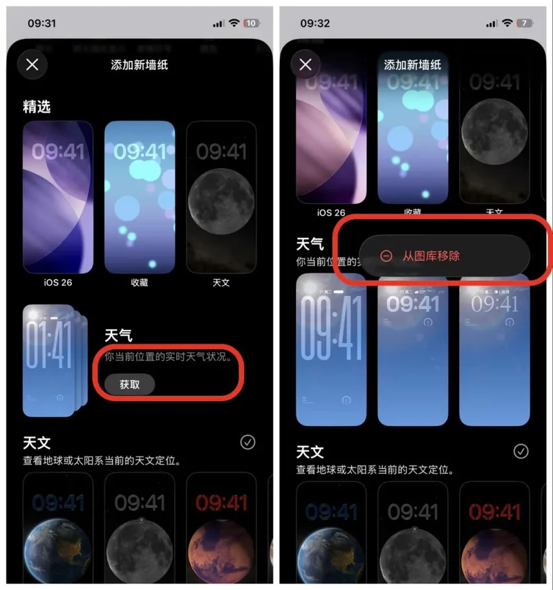 iOS 26.4 beta 的墙纸功能也有了新的改进:它允许用户自行下载天气、天文、表情符号等各类墙纸下载到 iPhone 上,而且还能移除已下载的墙纸减少空间占用。