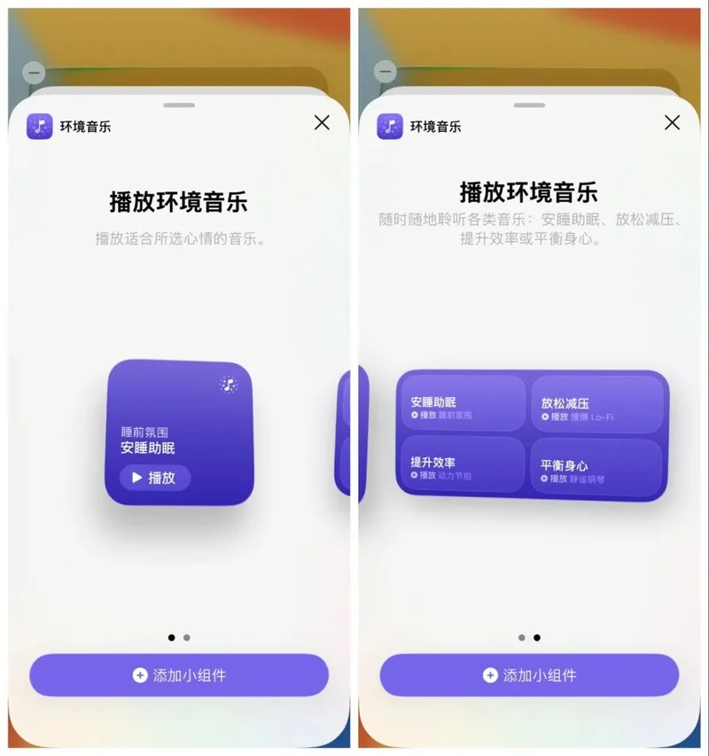 这次更新,增加了新的环境音乐小组件,可以在设置在主屏幕和锁屏界面。它支持播放不同的内置环境音乐,有快速播放睡眠、提高效率等四类背景音乐。