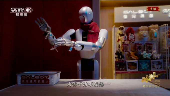 银河通用的机器人用的是轮式底盘加折叠腿,在春晚舞台上它看起来没有宇树那么“帅”,但银河通用强调的是另一件事:观众看到的是机器人在“干活”。