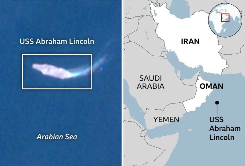 BBC查核卫星影像证实,美军核动力航舰“林肯号”目前位处阿曼外海的阿拉伯海,距离伊朗仅约700公里。 (图翻摄自BBC网页)