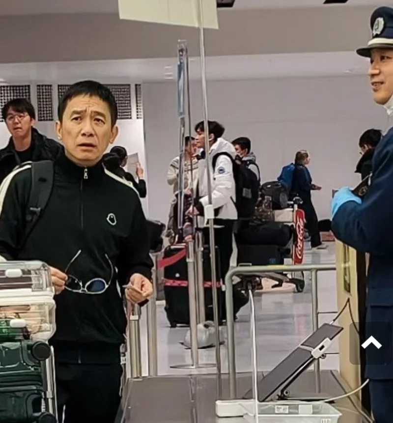 照片里的梁朝伟,穿着黑色运动服,手里拿着眼镜,站在海关柜台前,既没有看镜头,也没有看工作人员,而是经典重现了他那双电眼的另一种功能——发射求救信号。他眉头微皱,双眼迷茫地望向远方,眼神里写满了“我是谁?我在哪?我要干什么?”的哲学三连问。而顺着他的视线看过去,早已轻松通关的刘嘉玲,身穿棕色毛绒外套,头戴一顶亮眼的蓝色毛线帽,双手悠闲地插在兜里,正淡定地站在一旁注视着这一切。