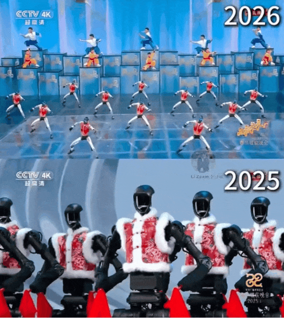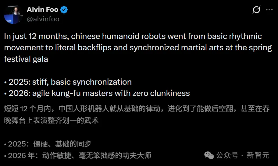 但到了26年,画风就完全不一样了。这帮机器人腾空而起,每个后空翻都干净利落。转身,收拳,起势,一套动作行云流水,简直进化成了少林寺武僧。