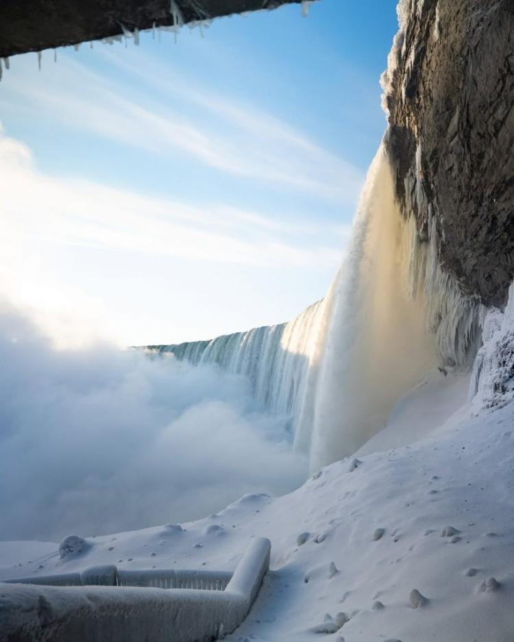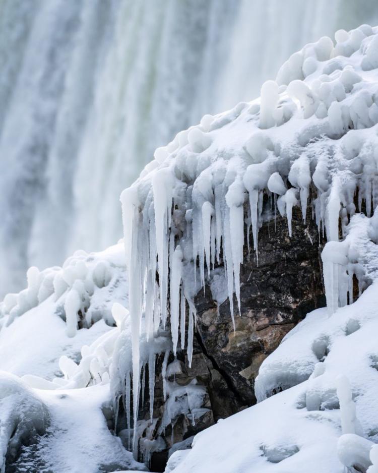 在瀑布周围,到处可见冰的形成物,包括在美国瀑布底部堆积起来的巨大冰丘。这种情况并非每年都会出现,而这也是自 2015 年以来,人们所见过最多的一次冰层。