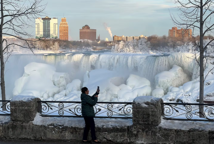 周一气温虽然远低于冰点,但仍无法阻止大批游客涌向尼亚加拉瀑布,一睹这座世界自然奇观部分结冰的景象。