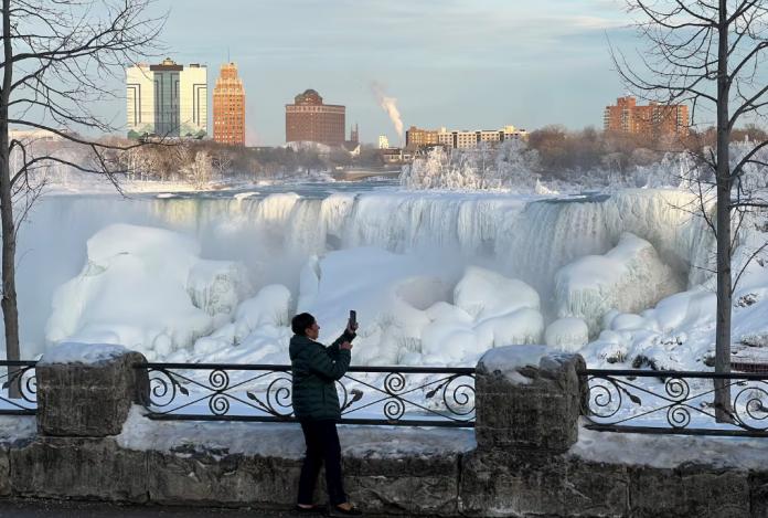 尽管气温在零下,游客仍持续前往尼亚加拉瀑布,欣赏壮观的冰层堆积。(CTV 新闻)