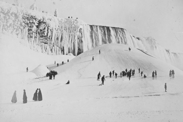 19 世纪末的一张照片显示,人们站在一座临时形成、连接美国与加拿大的冰桥上。1912 年发生致命坍塌后,行走于冰桥上被禁止。(尼亚加拉公园委员会)