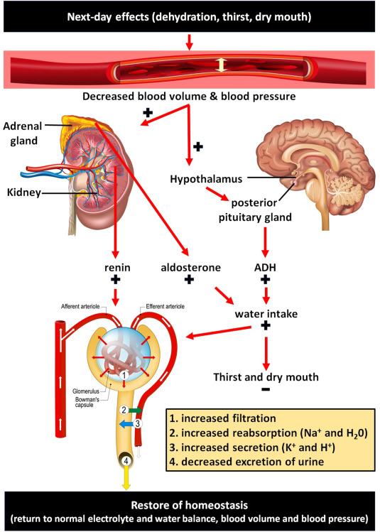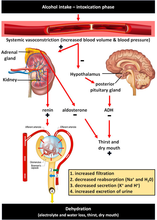 由于酒精具有利尿作用,口渴、干口在第二天很常见[3]。因此,第二天多喝水能缓解口渴、干口等不适,可以帮助身体恢复水电解质平衡,但对头痛、乏力、注意力下降等宿醉核心症状影响有限。