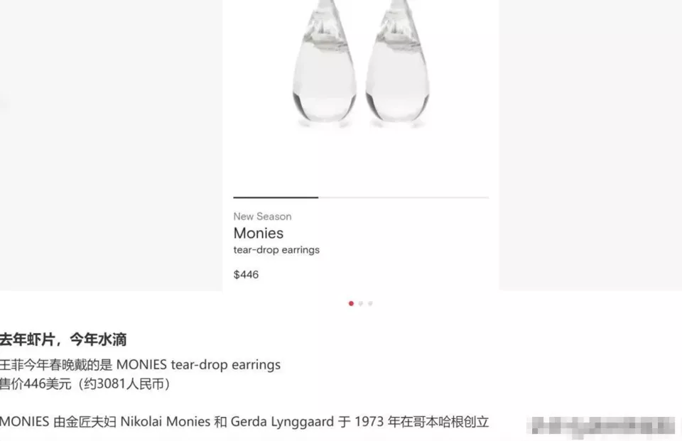 演出后多条王菲相关词条登热搜,其佩戴的水滴耳环再度出圈,这款耳环与2025年春晚她戴的 “虾片耳环” 同属丹麦小众首饰品牌Monies,水滴耳环售价446美元,约合人民币 3081 元,该品牌由金匠夫妇1973年在哥本哈根创立。