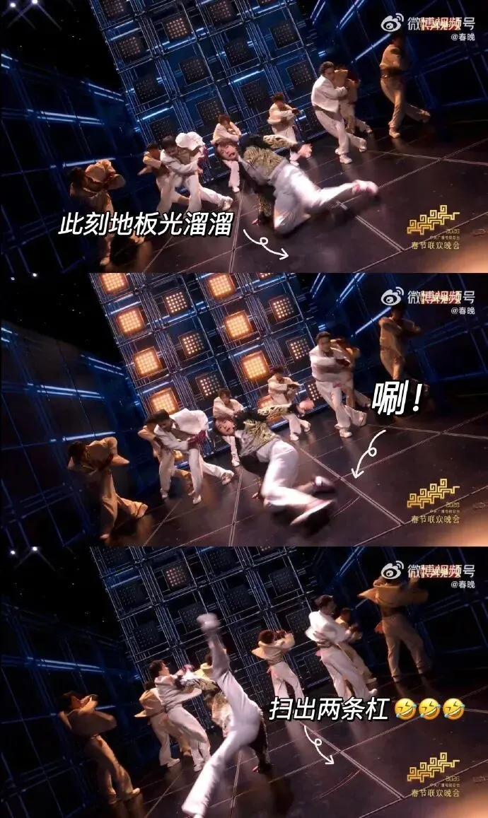 此外,表演开场瞬间,王一博因所穿的镶钻定制鞋鞋底打滑导致动作下沉,但迅速调整重心稳住节奏。