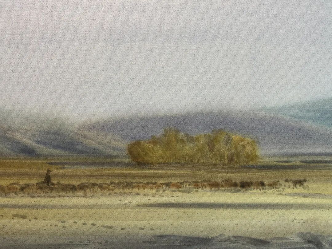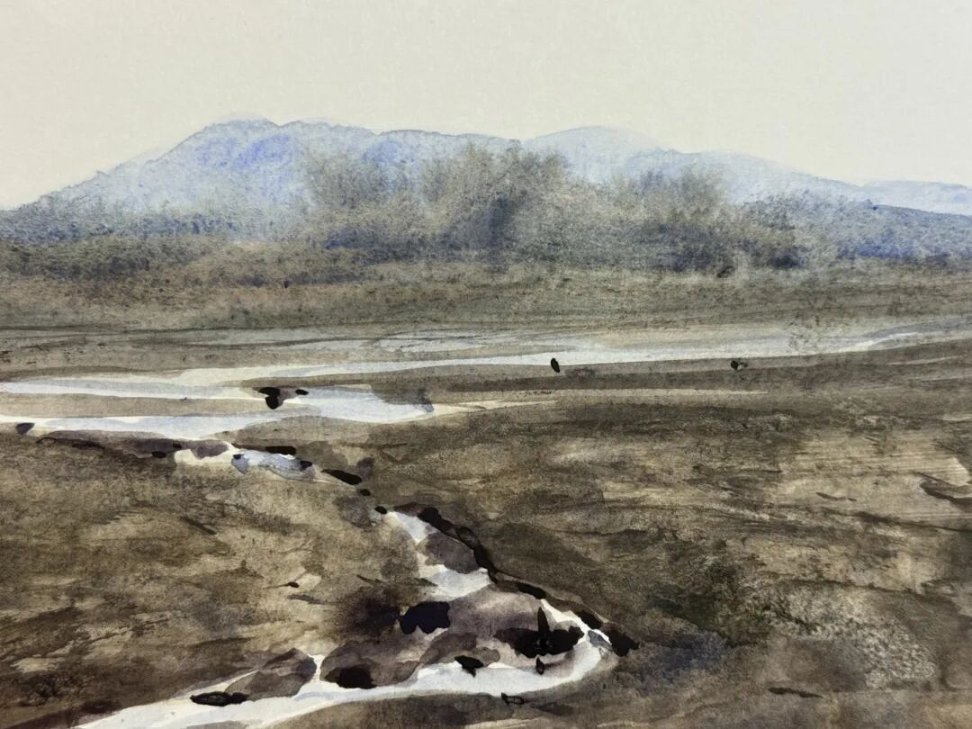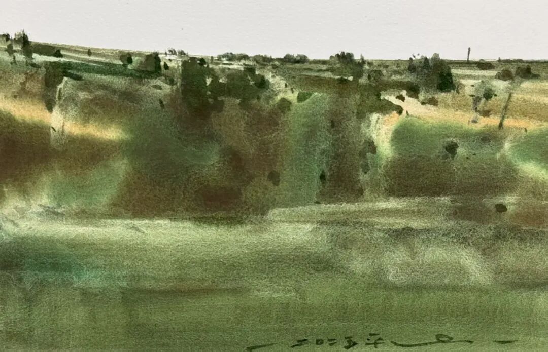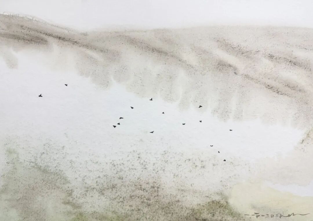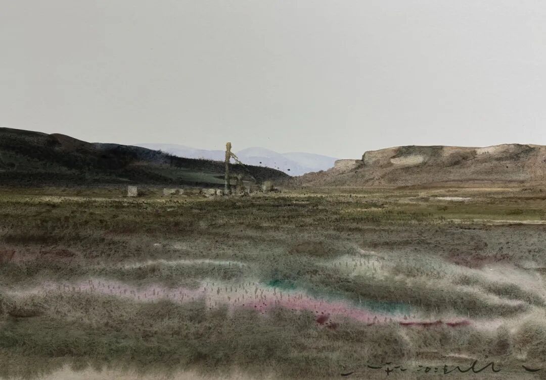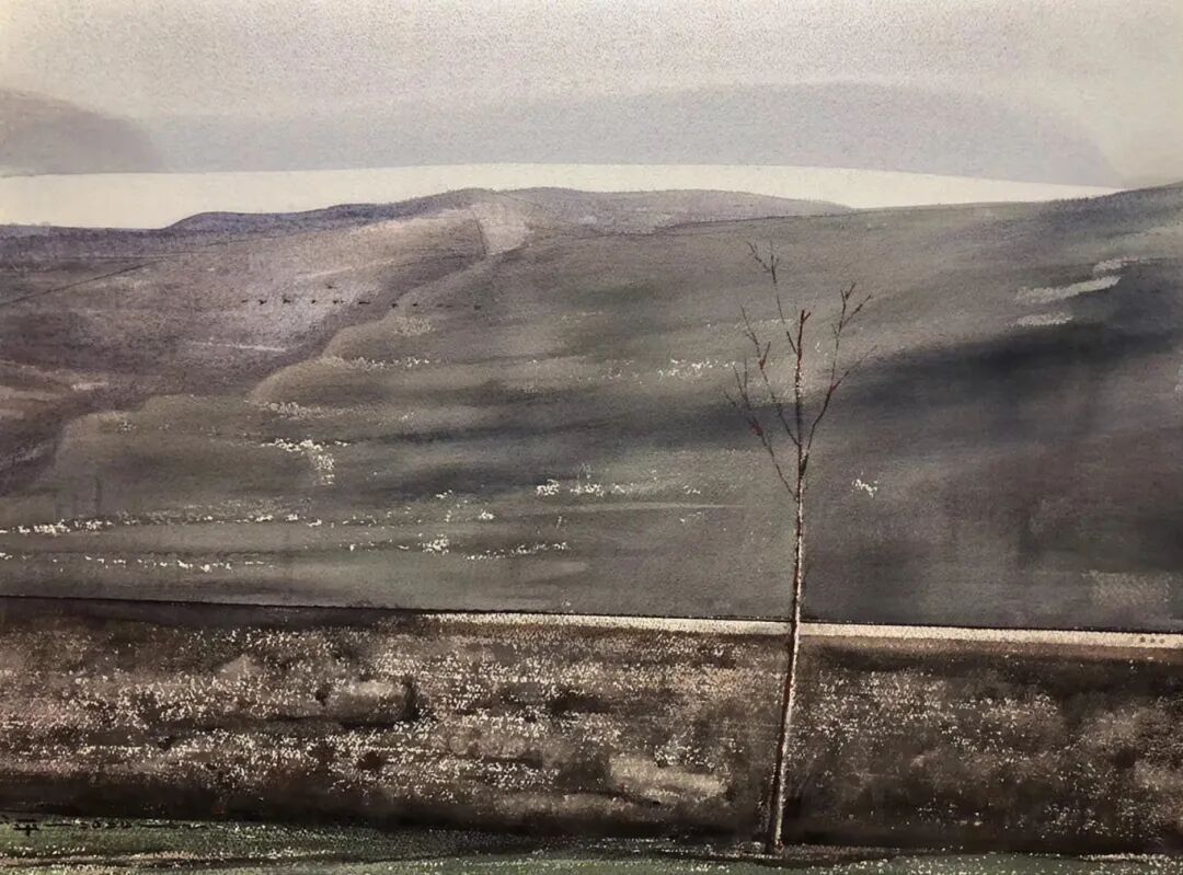 高攀峰的水彩创作,将“意境”作为艺术的灵魂。其作品如《荒原凝寂》《平芜尽处》,摒弃了西方水彩对自然物象的精细描摹,转而追求“虚静空明”的东方审美境界。画面中大片的留白、晕染的水色,恰似中国山水画的“计白当黑”,荒原野丘的朦胧轮廓、墨色的淡远层次,营造出“言有尽而意无穷”的诗意氛围。这种意境并非对自然的简单复刻,而是艺术家内心与天地自然的精神共鸣,是中国文人画“天人合一”理念在水彩中的当代诠释。
