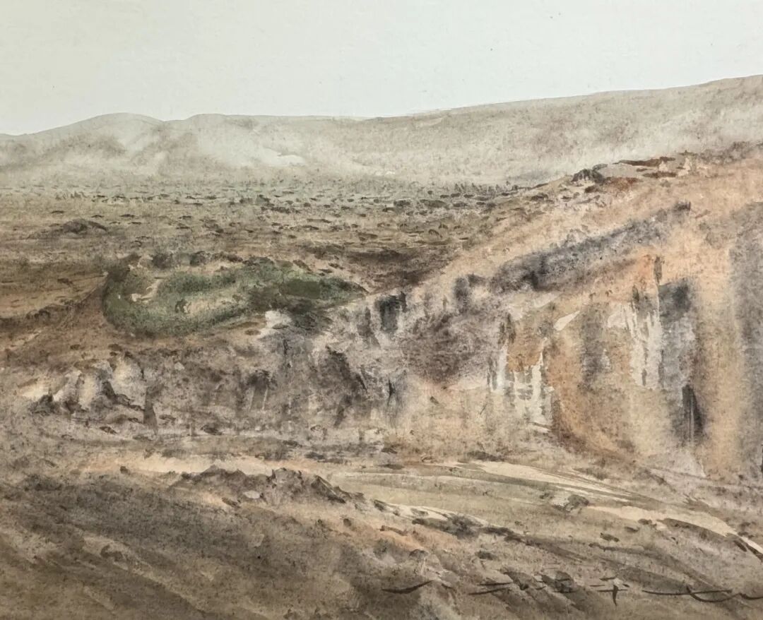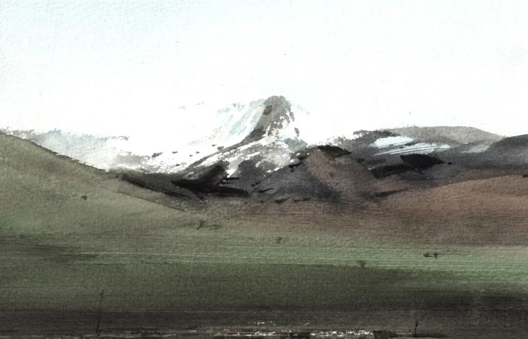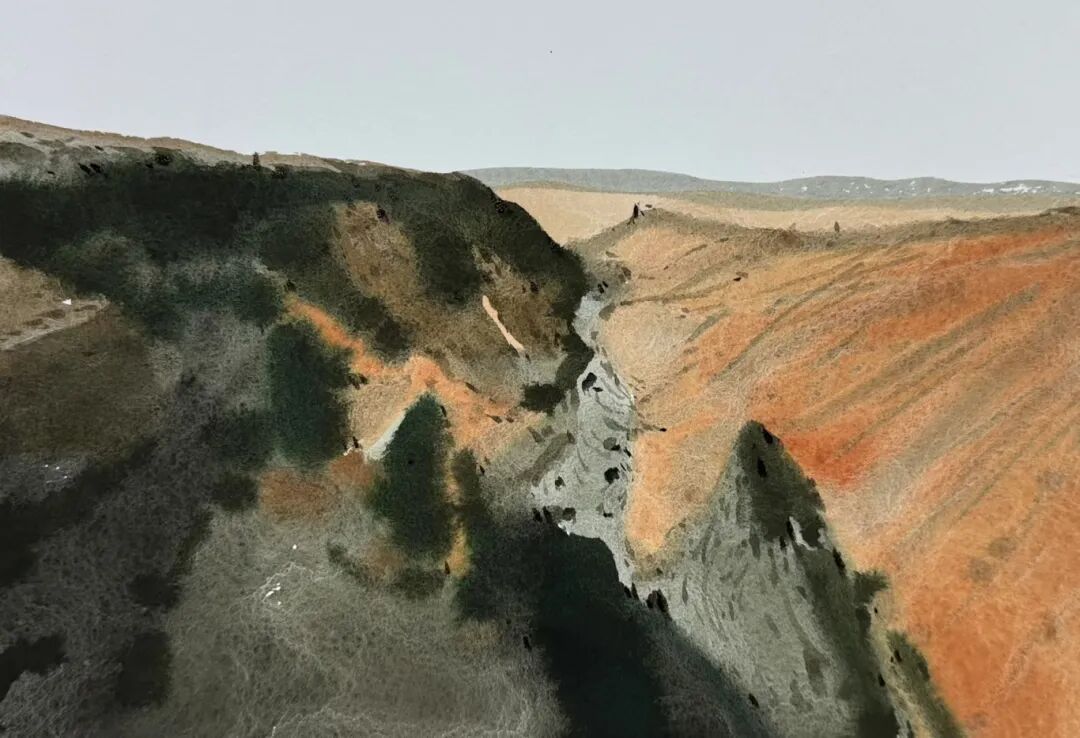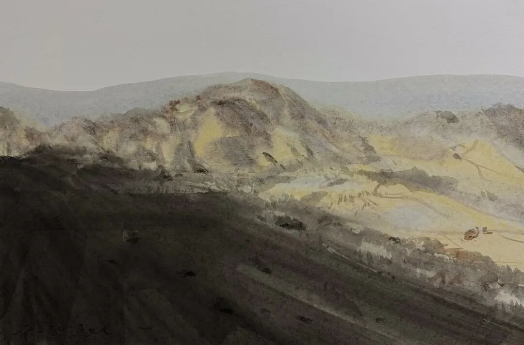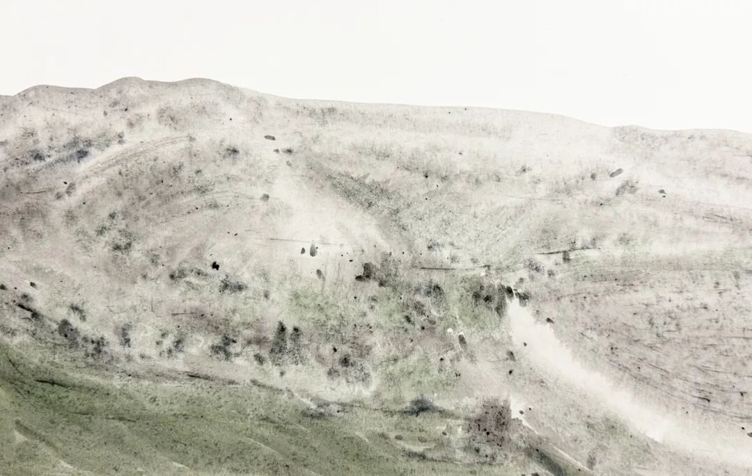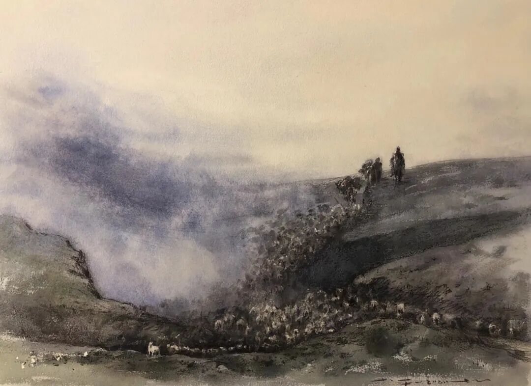 高攀峰的水彩创作,将“意境”作为艺术的灵魂。其作品如《荒原凝寂》《平芜尽处》,摒弃了西方水彩对自然物象的精细描摹,转而追求“虚静空明”的东方审美境界。画面中大片的留白、晕染的水色,恰似中国山水画的“计白当黑”,荒原野丘的朦胧轮廓、墨色的淡远层次,营造出“言有尽而意无穷”的诗意氛围。这种意境并非对自然的简单复刻,而是艺术家内心与天地自然的精神共鸣,是中国文人画“天人合一”理念在水彩中的当代诠释。