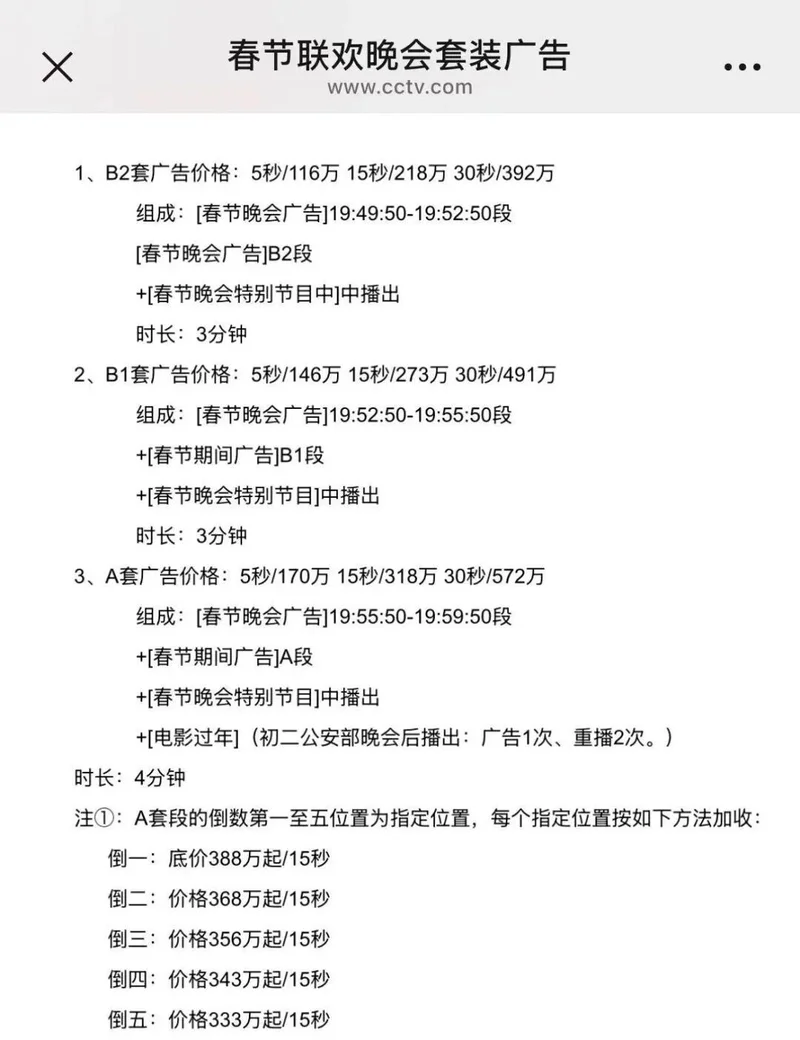 首先是春晚开场前的贴片广告时间,根据时段、时长,价格各有不同: