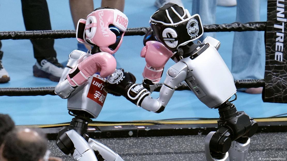 宇树人形机器人参加2025年世界人形机器人运动会自由搏击比赛。图像来源: Kyodo News/IMAGO