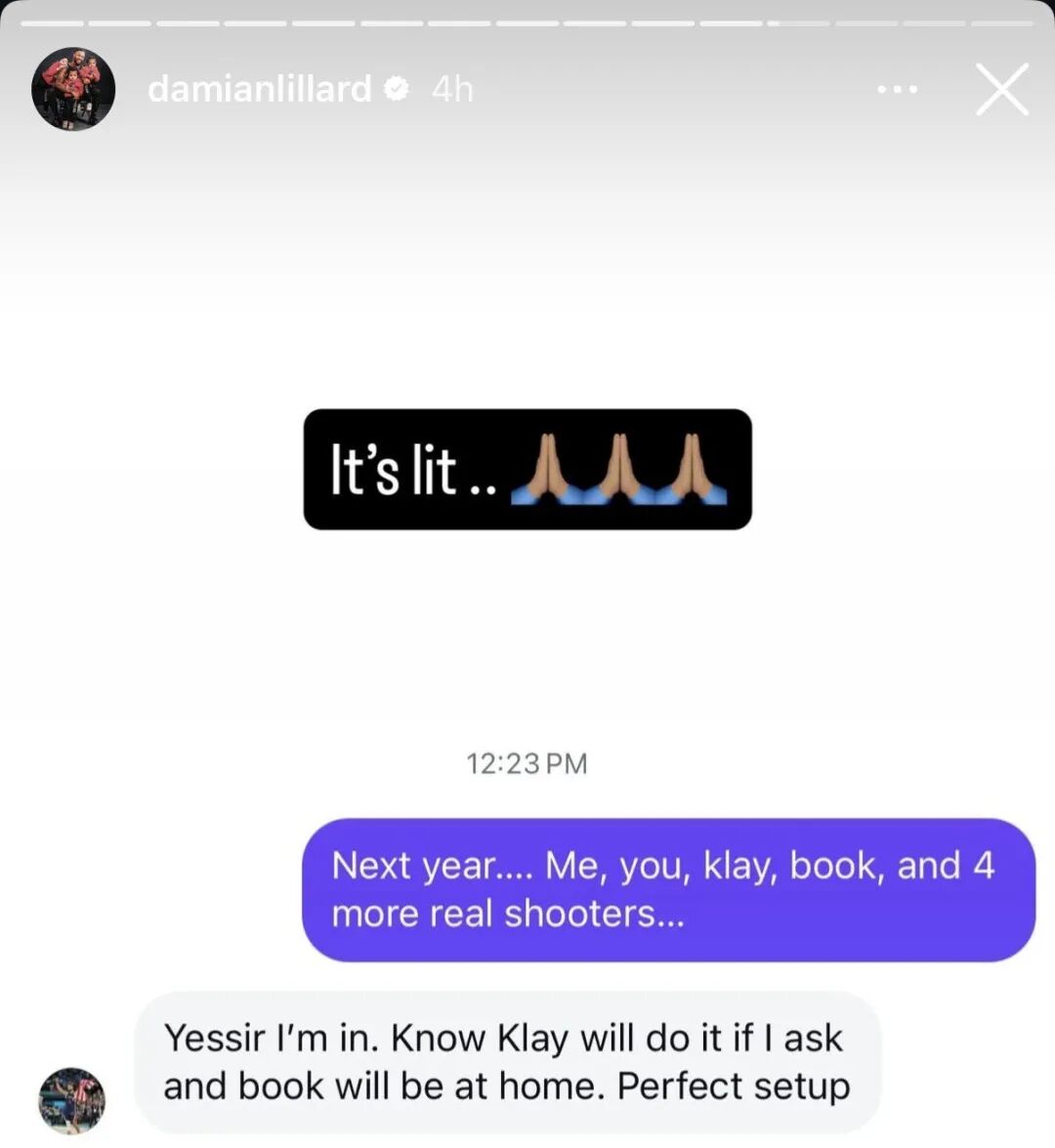 目前这件事已经得到了利拉德确认,利拉德在个人社交媒体上晒出了他与库里的聊天记录,具体如下: