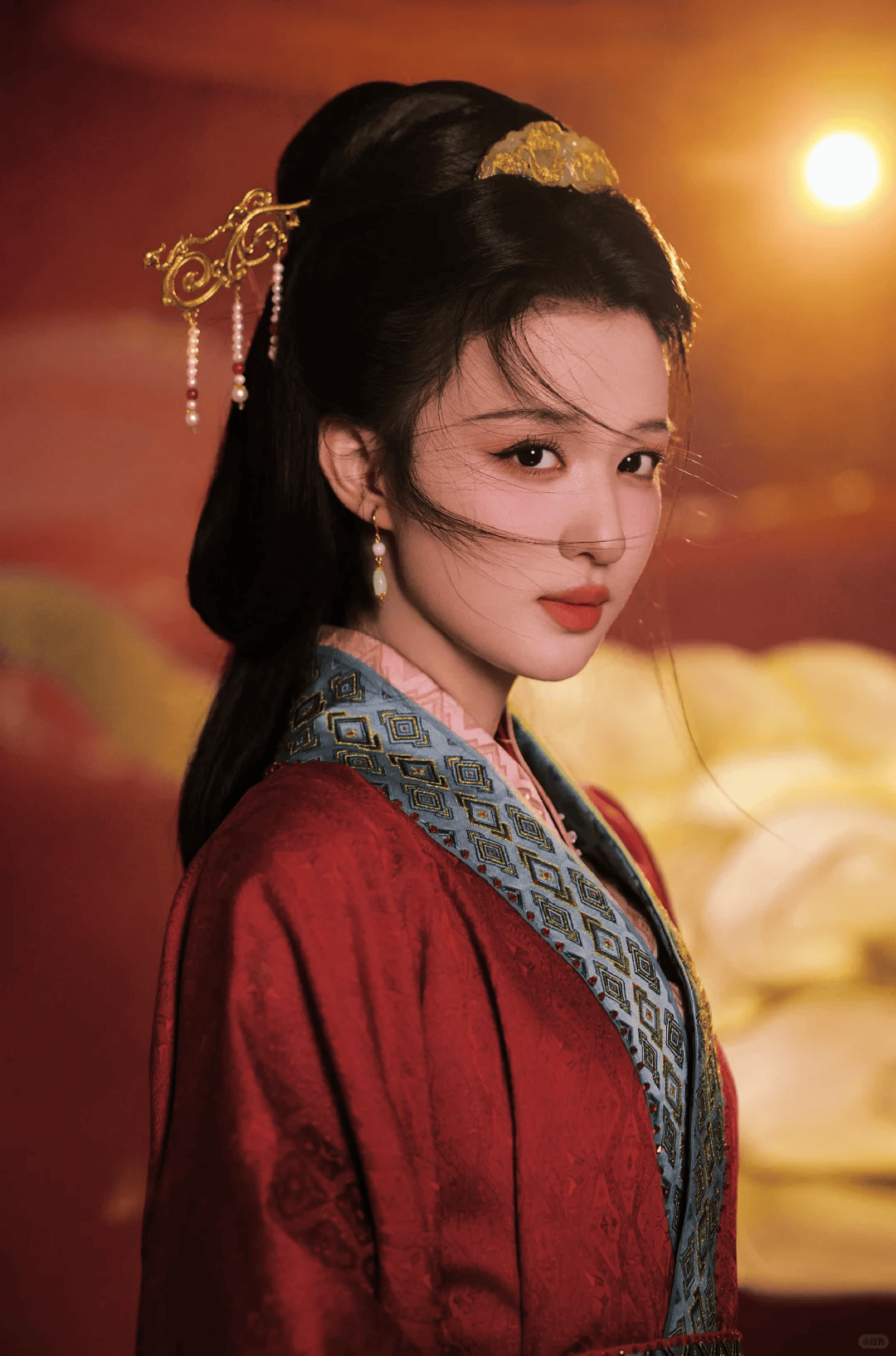 秦岚饰演桃花花神息夫人,一袭战国红袍站在桃花丛中,红衣似火,宛如画中仙。