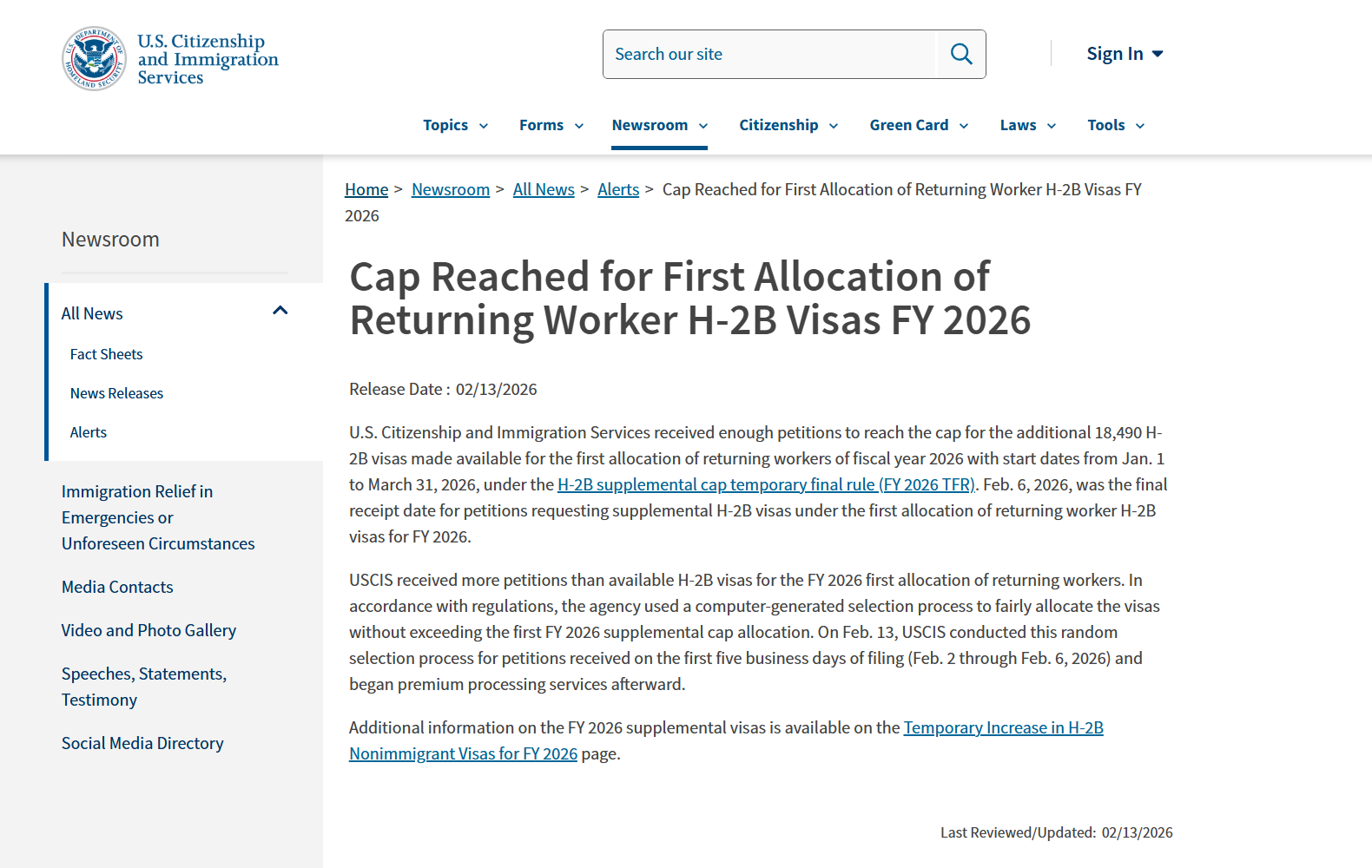 美国公民及移民服务局(USCIS)于2月13日宣布,2026财年首批“回流员工”(Returning Workers)H-2B临时工作签证的额外配额已全部用尽。