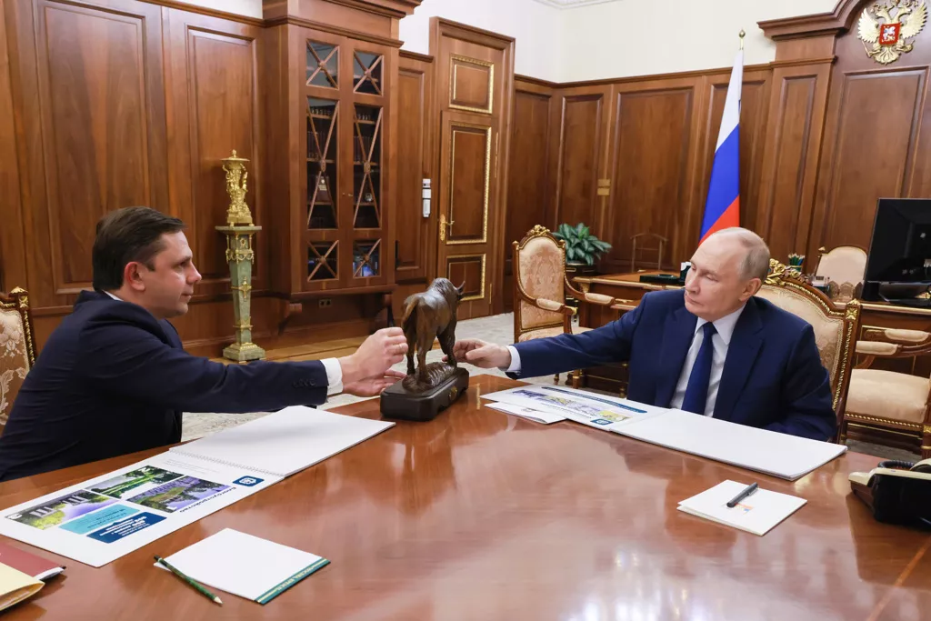 克宫16日发布的照片显示,普京伸出右手触摸奥廖尔州长致赠的野牛雕像。(美联社)