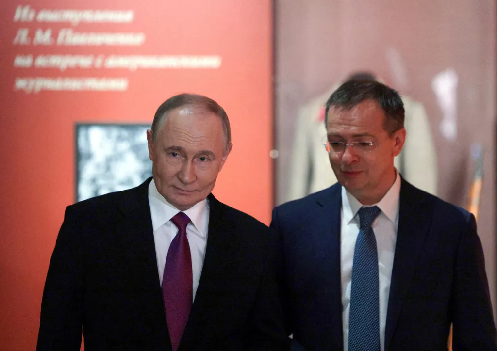 俄罗斯卫星通讯社(Sputnik)去年11月4日发布照片,普京在俄国国定假日“国家统一日”(National Unity Day)于莫斯科参观“俄罗斯东正教”展览。右为普京幕僚梅丁思基(Vladimir Medinsky)。(资料照/路透)