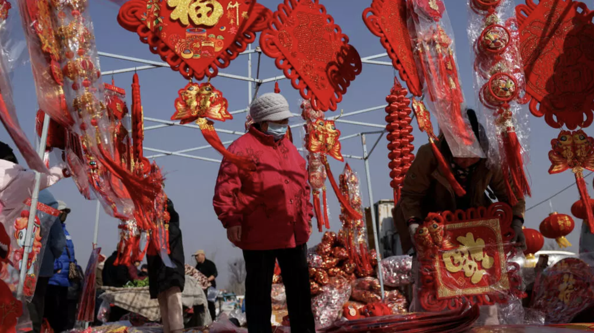 Un vendeur d'ornements pour la fête du Printemps sert un client dans un marché en plein air à l'approche du Nouvel An lunaire, à Pékin, en Chine, le 10 février 2026. © Tingshu Wang / Reuters