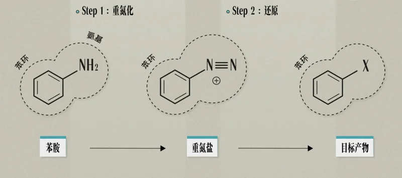 把苯胺放进去,就几乎可以变成任何想要的东西 —— 溴、氯、氰、羟基,甚至是氢本身,都能装上去。