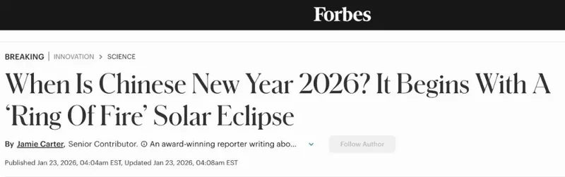《福布斯》杂志:哪一天是2026年的中国新年?它将以“火环日食”开启