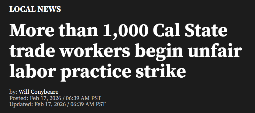 加州州立大学系统(California State University,简称CSU)超过1000名技术工种员工于2月17日周二发起全州范围的“不公平劳动行为”罢工,行动涉及22个校区。
