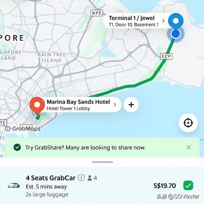 从机场grab到金沙酒店,车资要20新币(约110人民币),这还是只非繁忙时段,要是高峰期,估计要飙到40新币!