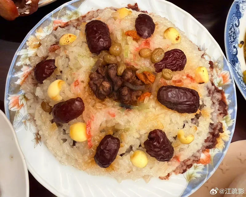 过年的哪能少得了八宝饭呢,江疏影家的年夜饭那些碟子也是“家的味道”,充满年代感。