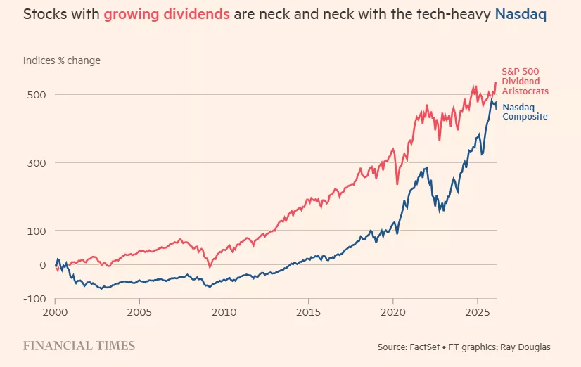 与成长股爱好者的看法相反,标普股息贵族指数,在过去25年的总回报与以科技股为主的纳斯达克指数不相上下,但波动性要低得多。