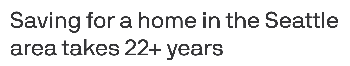 按Realtor.com的测算,一个年收入约11.7万美元的西雅图家庭,如果每年能够拿出5%的收入专门存首付,需要整整22.6年才能攒够13.4万美元。这一时长不仅远高于全美平均,也比2022年时约12年的水平翻了近一倍。
