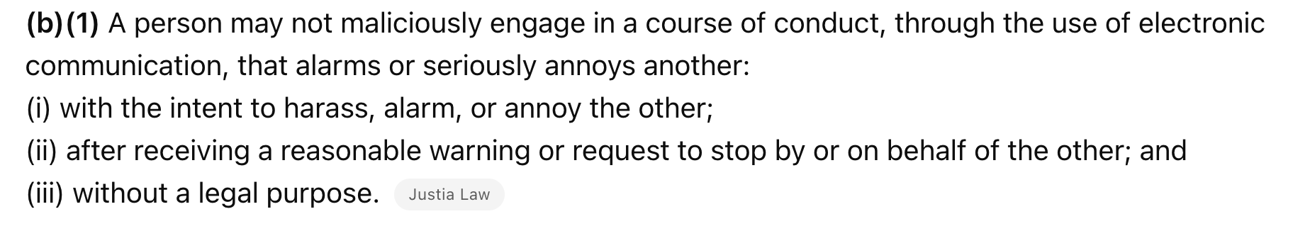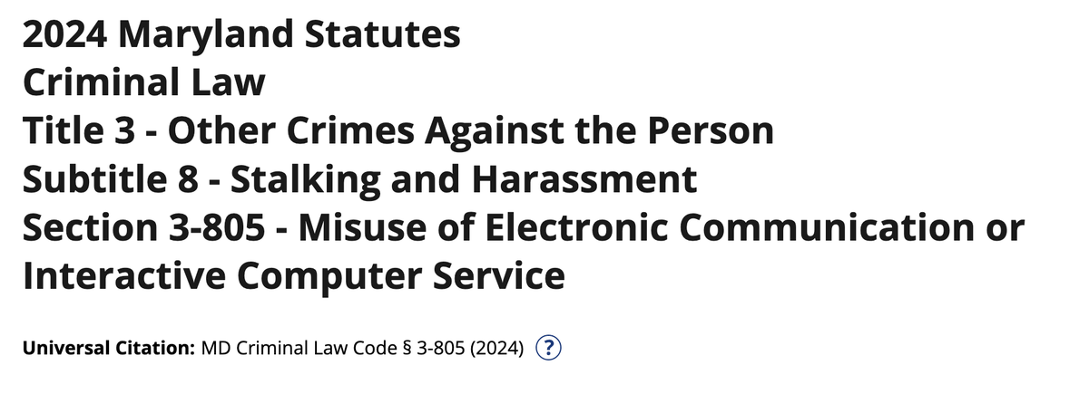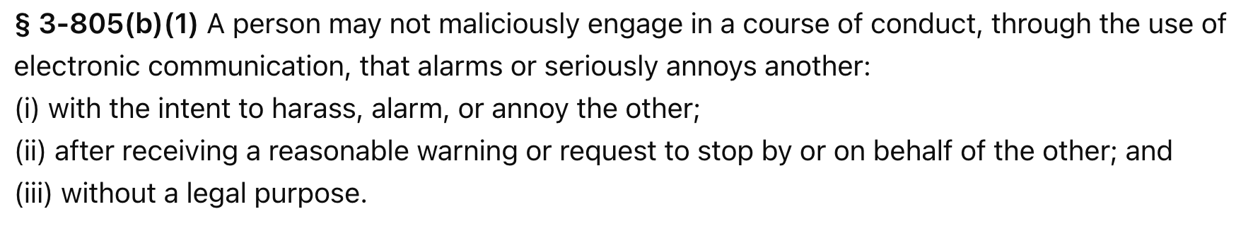 首先,从刑事层面看,马里兰州《刑法》第3杠803条(骚扰法律)明确规定,任何人不得以恶意方式进行骚扰行为,包括意图骚扰、烦扰或恐吓他人的行为。
