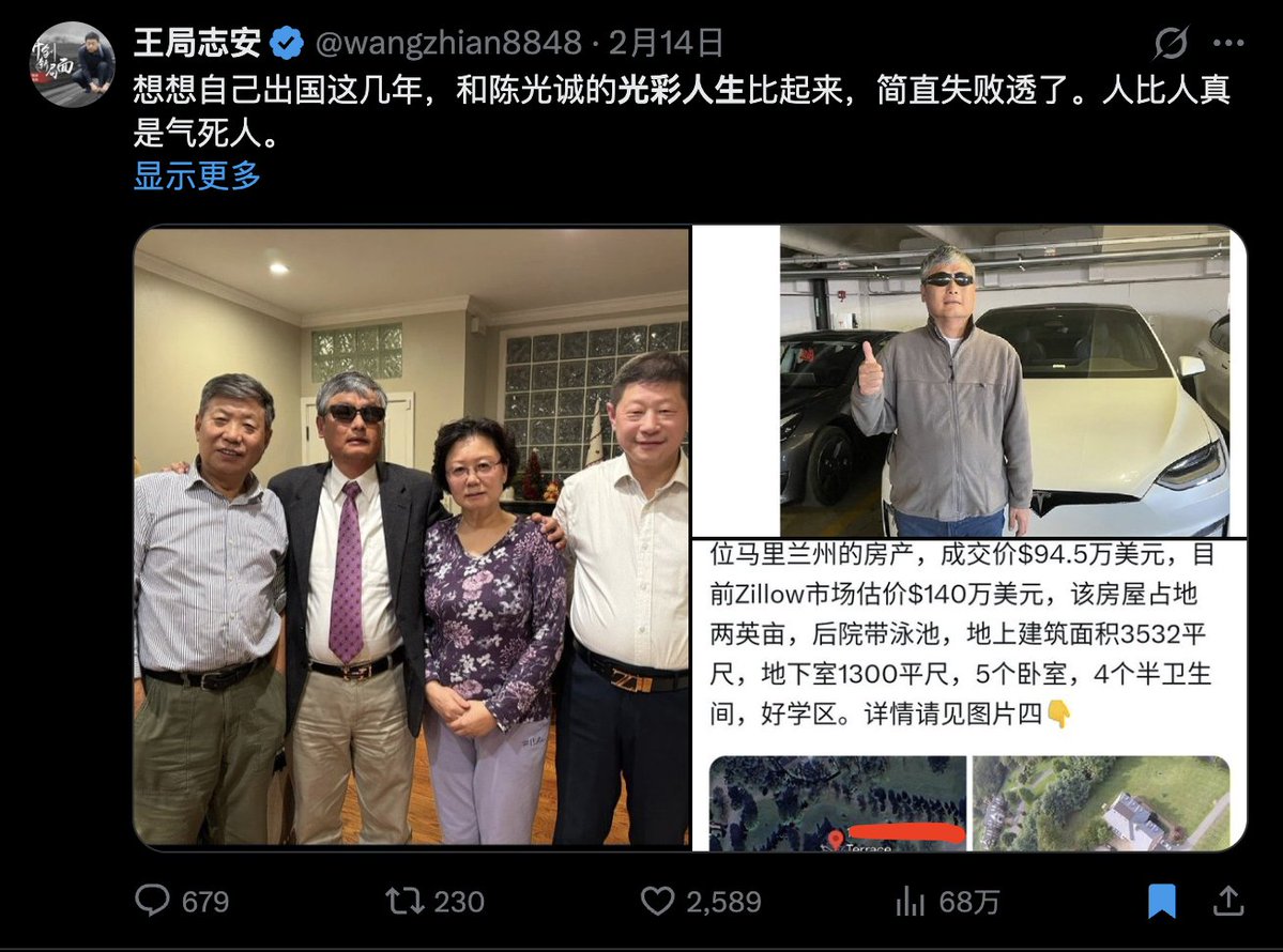 2月14日,他又发了一条长推,并转发了一年前网友“今月”发的陈光诚家房子的Zillow航拍图,上面赫然标有陈光诚的家庭地址。