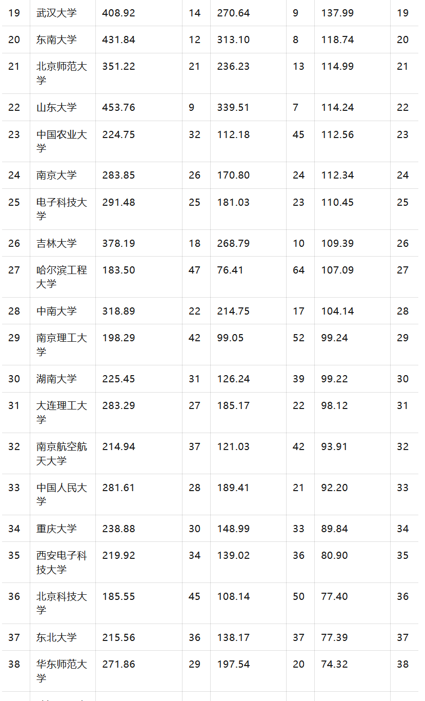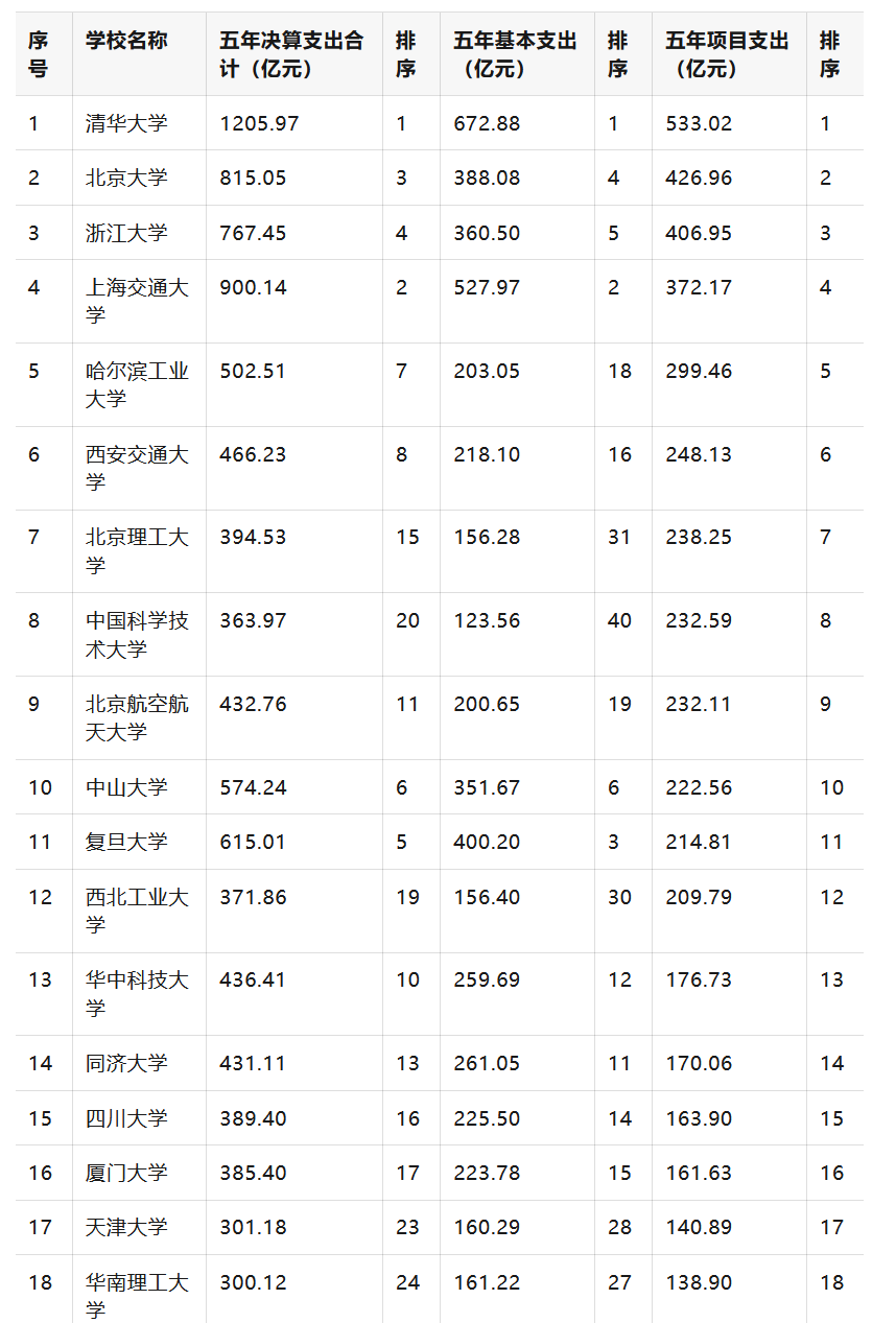 需要说明的是,各校决算支出并非主要来自国家财政直接拨款,而是以多元化收入为主。以清华大学为例,其1205.97亿元五年支出中,财政拨款仅占较小比例,大部分资金来源于竞争性科研经费、技术转让与知识产权收入、校办企业利润上缴、社会捐赠及校友募资等市场化和多元化渠道。其他高校亦呈现类似结构,决算规模大小很大程度上反映了学校获取竞争性资源和社会资金的能力,而非单纯依赖行政拨款。