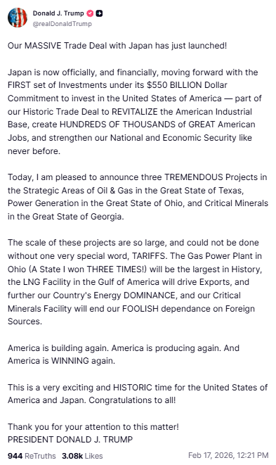 美国总统川普周二(2月17日)最新宣布,日本已正式启动其在对美“重大贸易协议”框架下承诺的5500亿美元投资计划的首批项目。