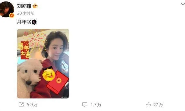 2026年2月17日,农历正月初一零点刚过,刘亦菲的微博更新了。 配文就三个字:“拜年咯。 ”点开图,很多人愣了一下。 镜头里的她,头发随意披散,脸上干干净净,什么粉底眼线口红,一概没有。 能清楚地看到皮肤自然的纹理,甚至鼻梁上那几颗若隐若现的小雀斑。 她穿着一件宽松的红色毛衣,搭配黑色居家裤,整个人陷在沙发里,对着手机镜头微笑。 一只雪白的、毛茸茸的小狗从她背后探出头,好奇地看着屏幕。