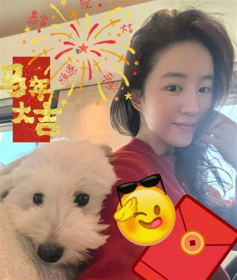 刘亦菲的拜年动态,并没有停留在明星单方面发布的层面。 它迅速演变成一场粉丝群体的集体狂欢和二次创作。 那张素颜抱狗的照片,成了绝佳的创作素材。 擅长设计的粉丝,第一时间把它制作成了各式各样的“新年红包封面”和“手机壁纸”,在社交圈里流传。
