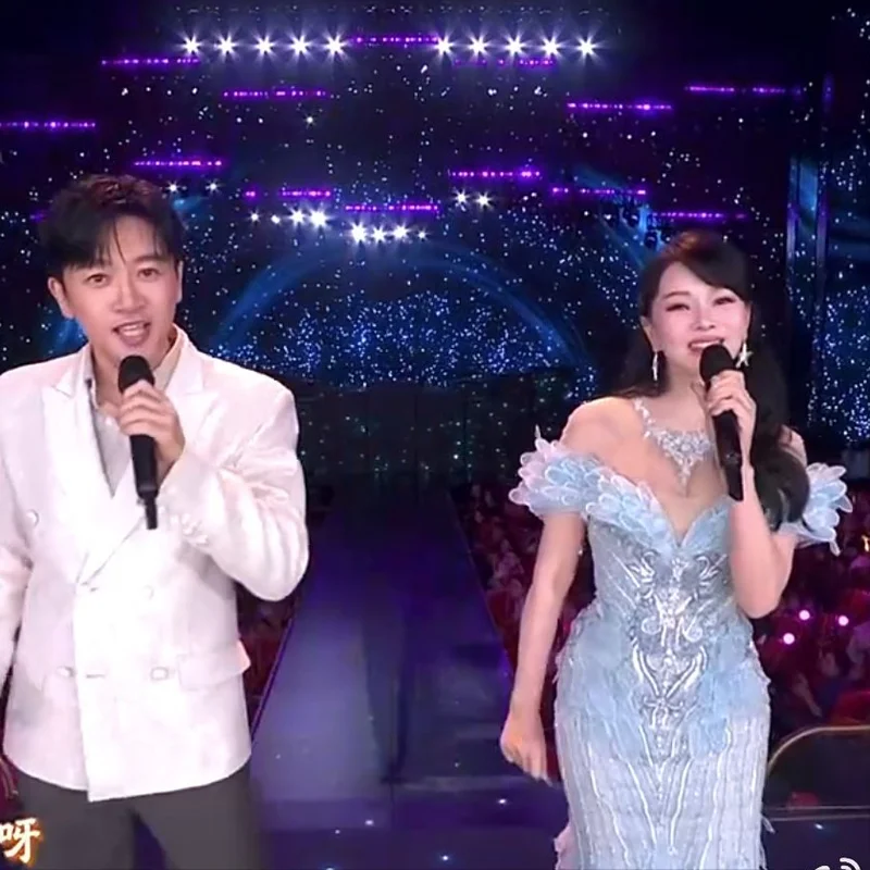 但到了舞台上,伊能静气血十足、容光焕发,一身淡蓝色水钻礼服典雅大气,勾勒出玲珑曲线,令人直呼:岁月从不败美人!