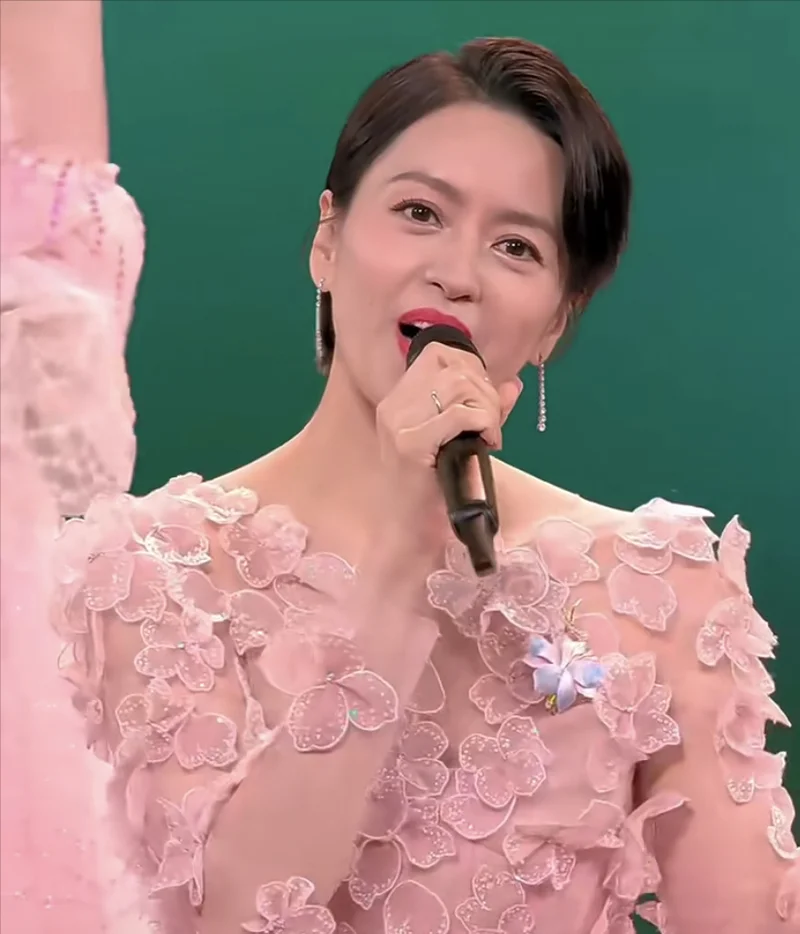 一袭淡粉色连衣裙不算最隆重,却刚好衬托出周慧敏的内敛秀美,依旧是一头黑长直搭配耳后的一朵小花,增加了俏皮感。