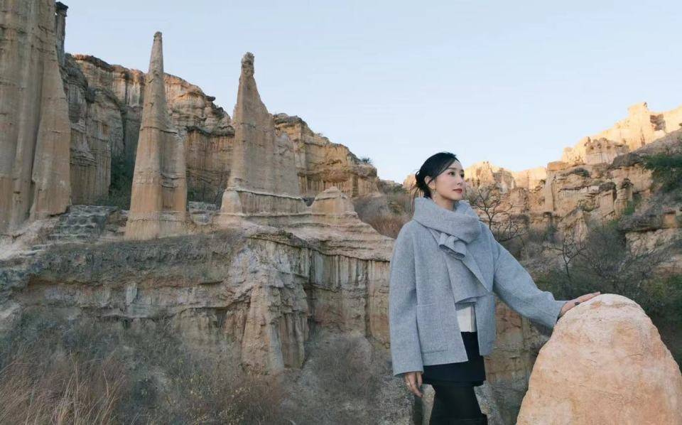 胡静穿的是一件灰蓝色的长大衣,围巾颜色与土林浑然一体,没有滤镜,没有摆拍,像老友重逢般平静地站在百万年风蚀的奇观前。照片里,土柱如城堡、如利剑、如沉睡的巨兽,沟壑纵横,光影流转,每一寸黄土都藏着170万年前元谋人的足迹。她不是在打卡,是在认祖归宗。