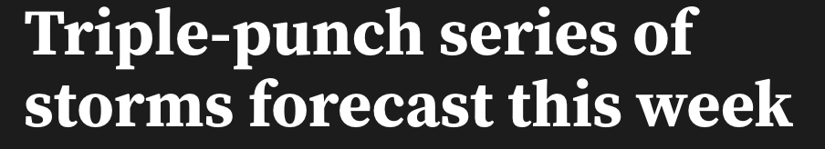 时间点: 第三轮风暴系统预计将于 周三(18日)晚些时候 抵达,强度将在 周四(19日) 达到顶峰,影响一直持续至周五。